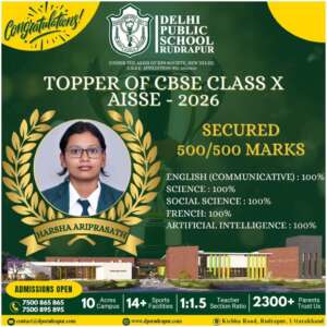 रुद्रपुर के किच्छा रोड पर स्थित दिल्ली पब्लिक स्कूल के विद्यार्थियों ने CBSE 10 वीं के बोर्ड परीक्षा में सफलता का इतिहास रचते हुए विद्यालय को गौरवान्वित किया है…DPS रुद्रपुर के इस वर्ष का परीक्षा परिणाम भी शत-प्रतिशत सफलता के साथ-साथ उच्च उपलब्धियों का प्रतीक बनकर उभरा है…10 वीं की बोर्ड परीक्षा परिणाम ने DPS की शैक्षणिक गुणवत्ता और अनुशासन को एक बार फिर सिद्ध किया है…विद्यालय की मेधावी छात्रा हर्षा अरिप्रसाथ ने तो 100% अंक प्राप्त कर एक ऐतिहासिक और बड़ी प्रेरणादायक उपलब्धि हासिल की है… हर्षा की ये सफलता उनके अथक परिश्रम,दृढ़ संकल्प,समयबद्ध अध्ययन और उत्कृष्टता के प्रति समर्पण का प्रत्यक्ष उदाहरण है… हर्षा ने अपनी इस शानदार उपलब्धि से न केवल विद्यालय बल्कि पूरे रुद्रपुर का नाम भी राज्य और देश में रोशन किया है…